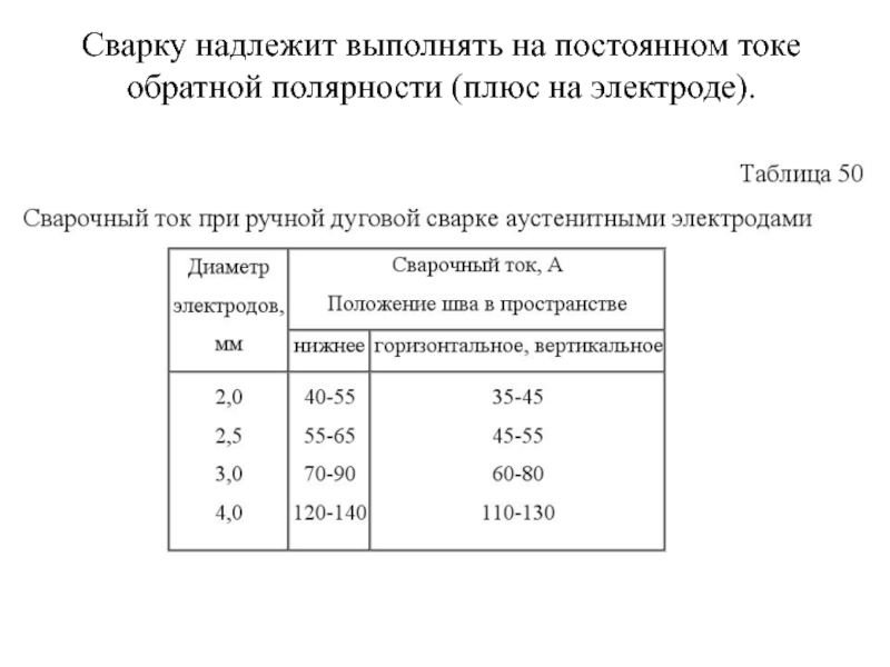 Слайд 49Сварку надлежит выполнять на постоянном токе обратной полярности (плюс на электроде).