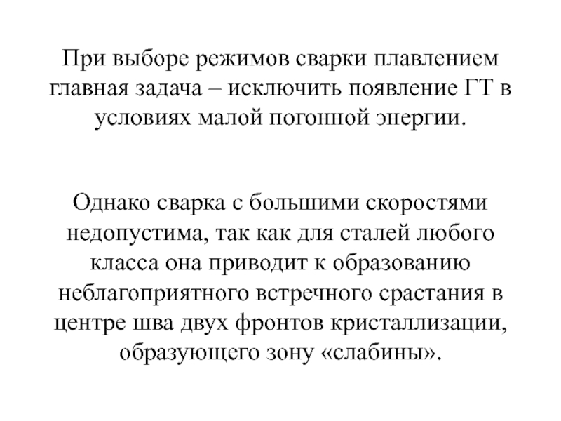 Слайд 43При выборе режимов сварки плавлением главная задача – исключить появление ГТ