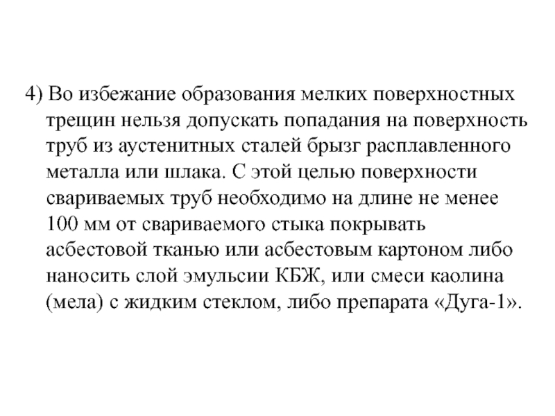 поверхность труб из аустенитных сталей брызг расплавленного металла или шлака. С этой целью поверхности свариваемых труб необходимо на длине не менее 100 мм от свариваемого стыка покрывать асбестовой тканью или асбестовым картоном либо наносить слой эмульсии КБЖ, или смеси каолина (мела) с жидким стеклом, либо препарата «Дуга-1».