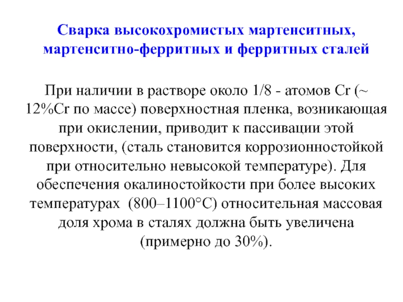 около 1/8 - атомов Cr (~ 12%Cr по массе) поверхностная пленка, возникающая при окислении, приводит к пассивации этой поверхности, (сталь становится коррозионностойкой при относительно невысокой температуре). Для обеспечения окалиностойкости при более высоких температурах (800–1100°С) относительная массовая доля хрома в сталях должна быть увеличена (примерно до 30%).
