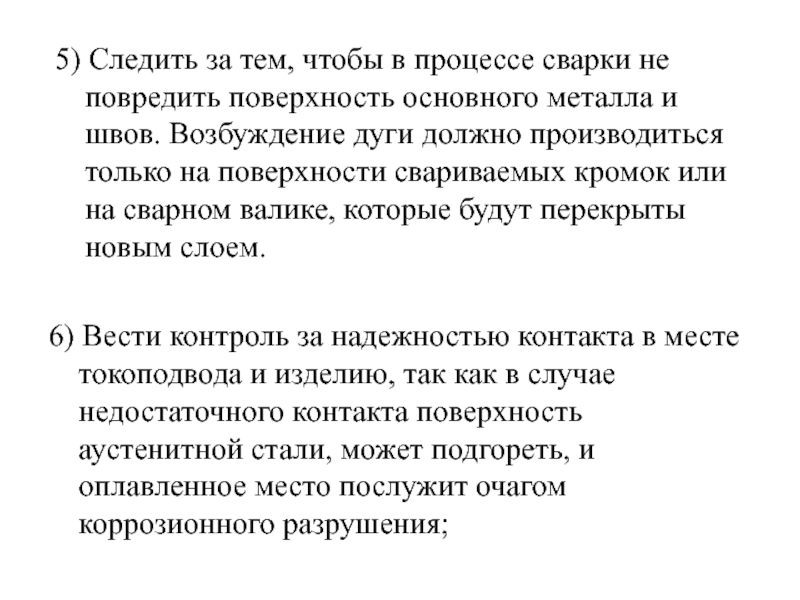 6) Вести контроль за надежностью контакта в месте токоподвода и изделию, так как в случае недостаточного контакта поверхность аустенитной стали, может подгореть, и оплавленное место послужит очагом коррозионного разрушения;