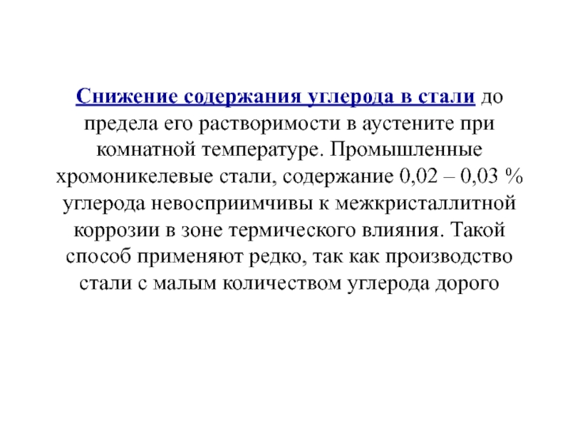 при комнатной температуре. Промышленные хромоникелевые стали, содержание 0,02 – 0,03 % углерода невосприимчивы к межкристаллитной коррозии в зоне термического влияния. Такой способ применяют редко, так как производство стали с малым количеством углерода дорого