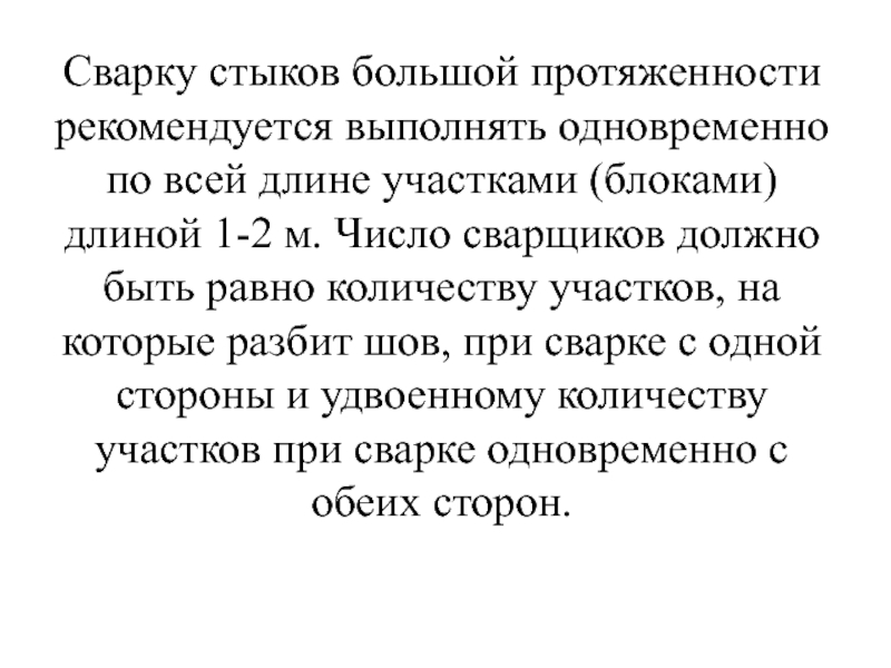 Слайд 54Сварку стыков большой протяженности рекомендуется выполнять одновременно по всей длине участками