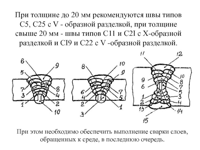 с учетом ширины разделки: при ширине менее 12 мм слои рекомендуется выполнять в один проход, при увеличении ширины количество проходов должно соответственно увеличиваться.
