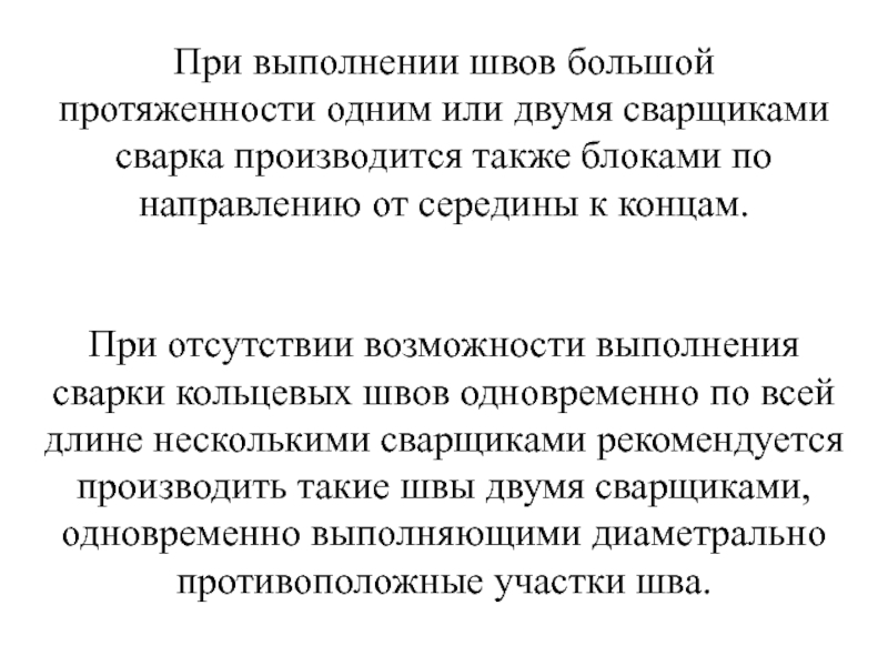 Слайд 55При выполнении швов большой протяженности одним или двумя сварщиками сварка производится