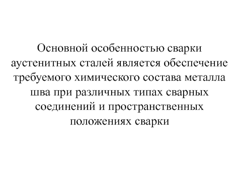 Слайд 46Основной особенностью сварки аустенитных сталей является обеспечение требуемого химического состава металла