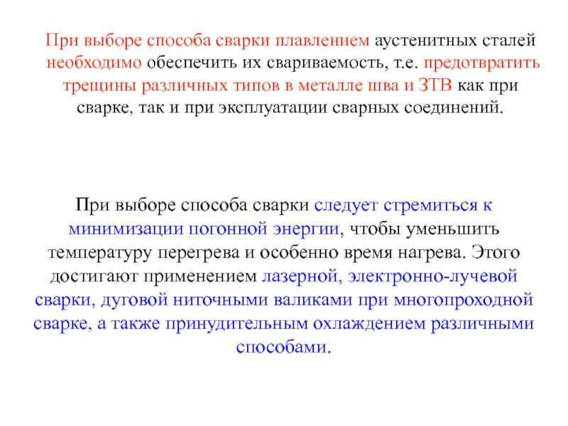 Слайд 42При выборе способа сварки плавлением аустенитных сталей необходимо обеспечить их свариваемость,