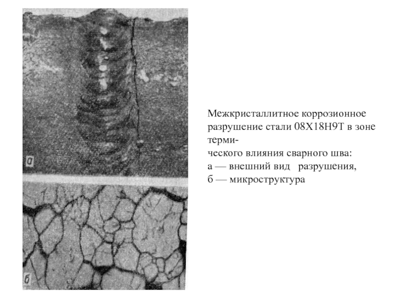 Слайд 29Межкристаллитное коррозионное разрушение стали 08Х18Н9Т в зоне терми-
