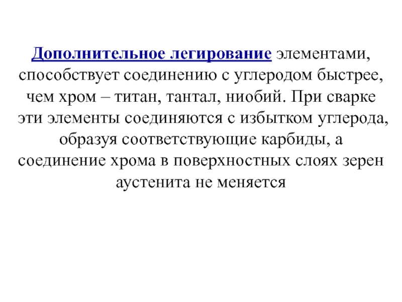 Слайд 34Дополнительное легирование элементами, способствует соединению с углеродом быстрее, чем хром –