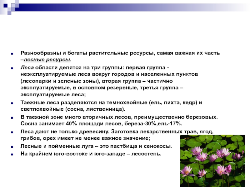 Разнообразны и богаты растительные ресурсы, самая важная их часть –лесные ресурсы.