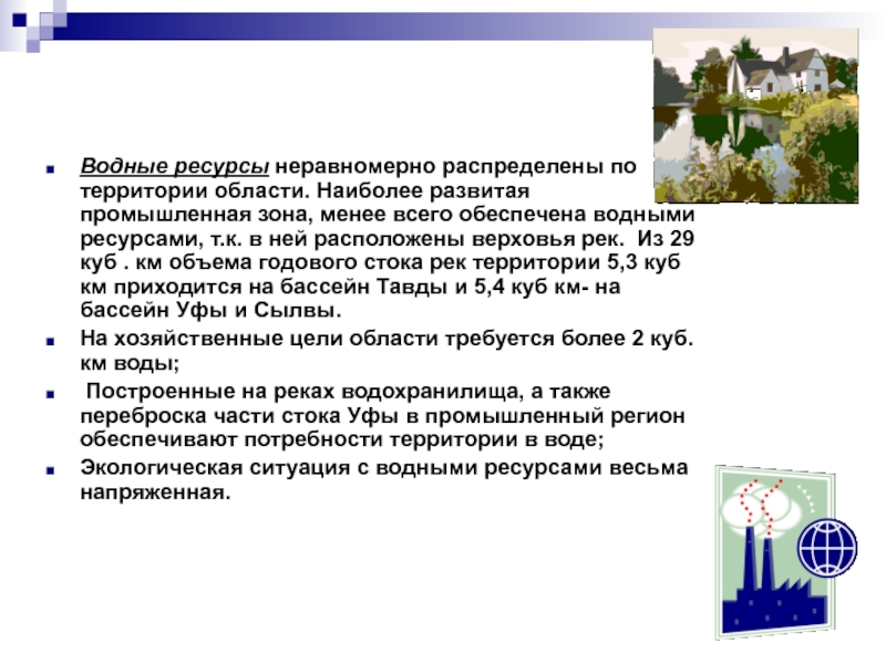 Водные ресурсы неравномерно распределены по территории области. Наиболее развитая промышленная зона,