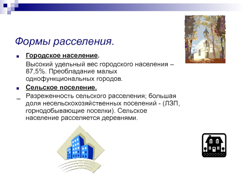 Разреженность сельского расселения; большая доля несельскохозяйственных поселений - (ЛЗП, горнодобывающие поселки). Сельское население расселяется деревнями.