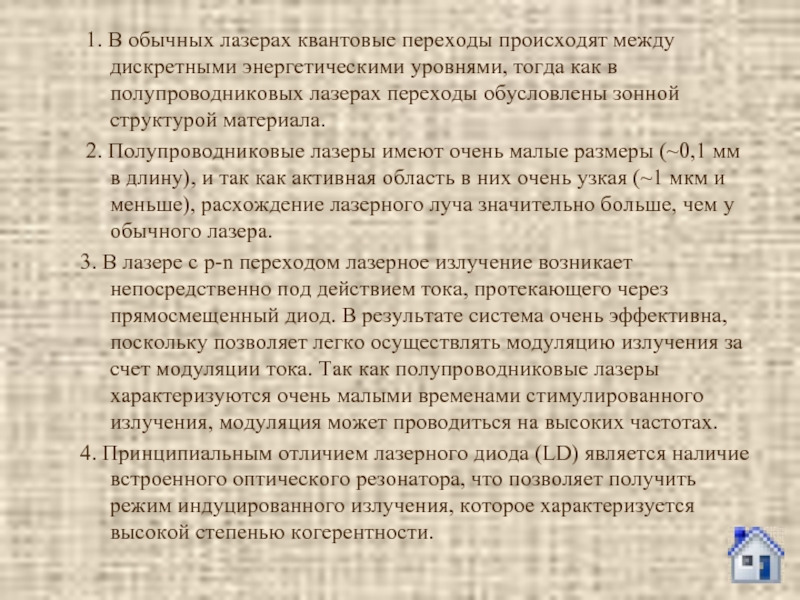 4. Принципиальным отличием лазерного диода (LD) является наличие встроенного оптического резонатора, что позволяет получить режим индуцированного излучения, которое характеризуется высокой степенью когерентности.