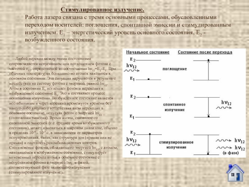 Любой переход между этими состояниями сопровождается испусканием или поглощением фотона с частотой ν12, определяемой из соотношения hν12=E2-E1. При обычных температурах большинство атомов находится в основном состоянии. Эта ситуация нарушается в результате воздействия на систему фотона с энергией, равной hν12. Атом в состоянии E1 поглощает фотон и переходит в возбужденное состояние Е2. Это и составляет процесс поглощения излучения. Возбужденное состояние является нестабильным и через короткий промежуток времени без какого-либо внешнего воздействия атом переходит в основное состояние, испуская фотон с энергией hν12 (спонтанная эмиссия). Время жизни, связанное со спонтанной эмиссией (т.е. среднее время возбужденного состояния), может изменяться в широком диапазоне, обычно в пределах 10-9 - 10-3 с, в зависимости от параметров полупроводника, таких, как структура зон (прямая или не прямая) и плотность рекомбинационных центров. Столкновение фотона, обладающего энергией hν12, с атомом, находящемся в возбужденном состоянии, стимулирует мгновенный переход атома в основное состояние с испусканием фотона с энергией hν12 и фазой, соответствующей фазе падающего излучения (стимулированное излучение).