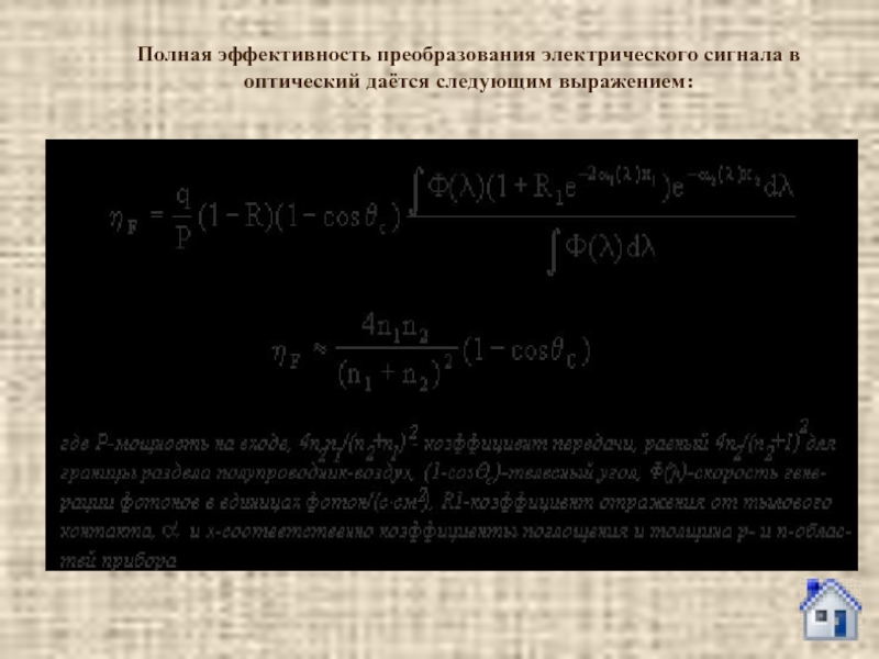 Слайд 11Полная эффективность преобразования электрического сигнала в оптический даётся следующим выражением: