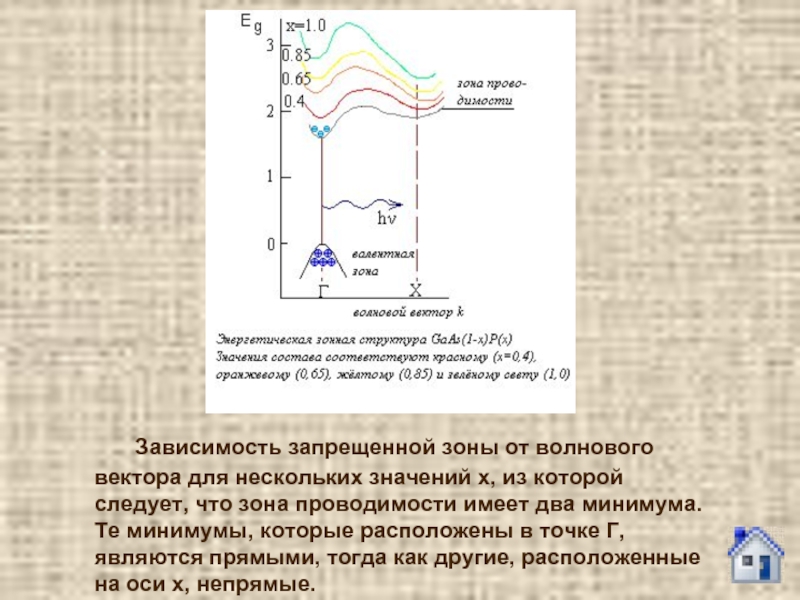 нескольких значений х, из которой следует, что зона проводимости имеет два минимума. Те минимумы, которые расположены в точке Г, являются прямыми, тогда как другие, расположенные на оси х, непрямые.