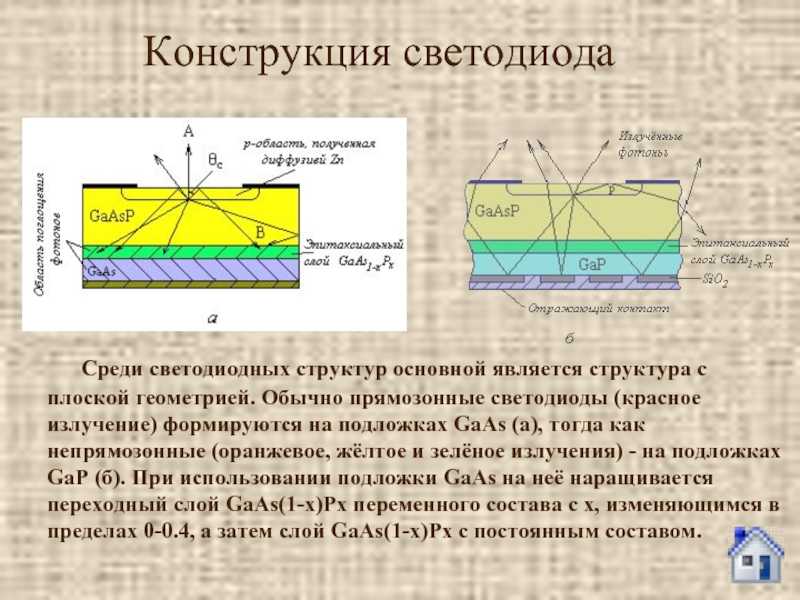 с плоской геометрией. Обычно прямозонные светодиоды (красное излучение) формируются на подложках GaAs (а), тогда как непрямозонные (оранжевое, жёлтое и зелёное излучения) - на подложках GaP (б). При использовании подложки GaAs на неё наращивается переходный слой GaAs(1-x)Px переменного состава с х, изменяющимся в пределах 0-0.4, а затем слой GaAs(1-x)Px с постоянным составом.