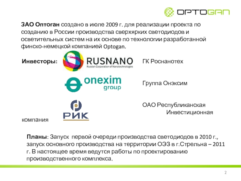 Планы: Запуск первой очереди производства светодиодов в 2010 г., запуск основного производства на территории ОЭЗ в г.Стрельна – 2011 г. В настоящее время ведутся работы по проектированию производственного комплекса.