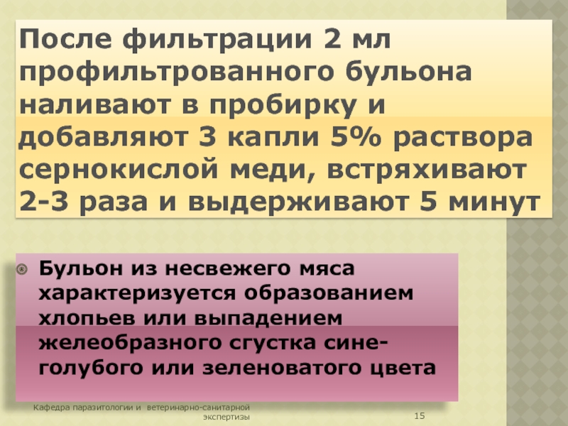 Бульон из несвежего мяса характеризуется образованием хлопьев или выпадением желеобразного сгустка сине-голубого или зеленоватого цвета