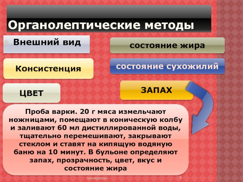Метод основан на выделении летучих жирных кислот, накопившихся в мясе при его хранении, и определении их количества титрованием дистиллята гидроокисью калия (или гидроокисью натрия).