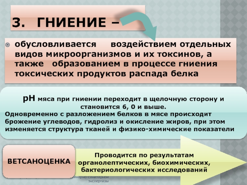 рН мяса при гниении переходит в щелочную сторону и становится 6, 0 и выше.