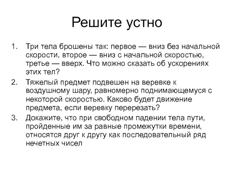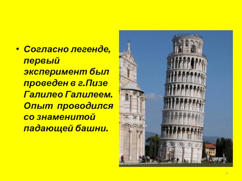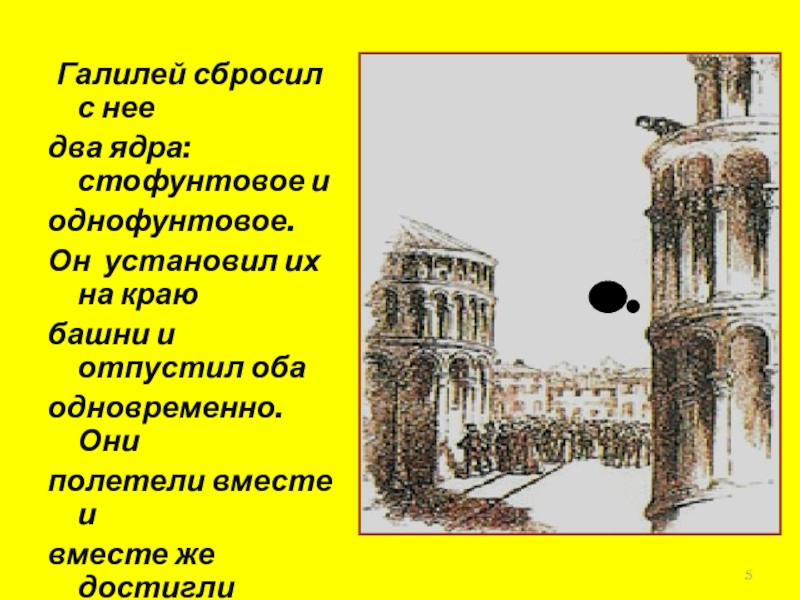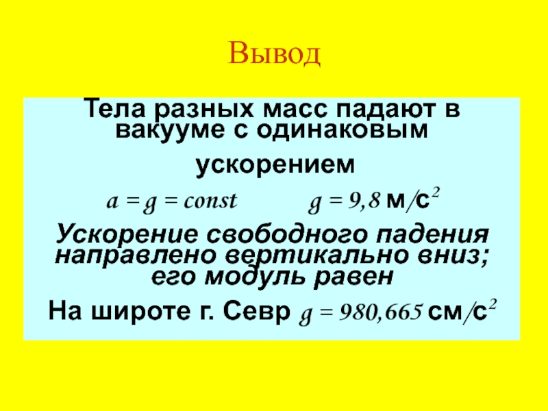 Галилей обнаружил, что шары одинакового диаметра, изготовленные из дерева, золота, слоновой кости, движутся по желобу с одинаковыми ускорениями а = 9,8 м/с2. Итак, ускорения не зависят от массы шаров!