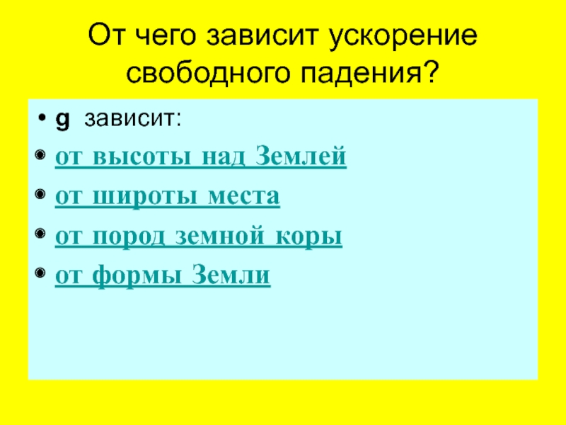 Ускорение свободного падения несколько изменяется в зависимости от географической широты места на поверхности Земли. (Причины этого будут выяснены дальше.) Но в одном и том же месте оно одинаково для всех тел.