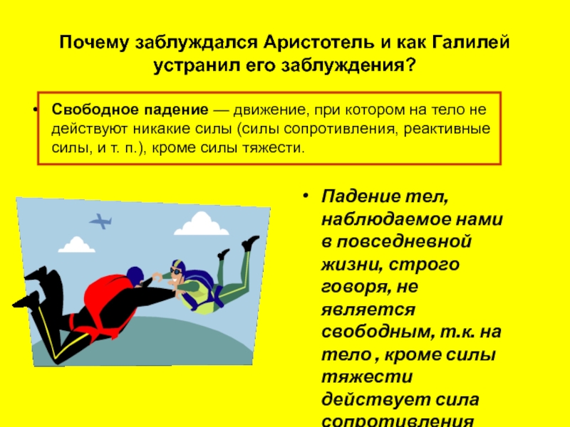 Падение тел, наблюдаемое нами в повседневной жизни, строго говоря, не является свободным, т.к. на тело , кроме силы тяжести действует сила сопротивления воздуха.