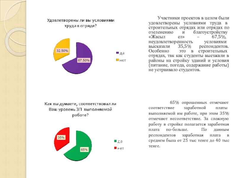 целом были удовлетворены условиями труда в строительных отрядах или отрядах по озеленению и благоустройству «Жасыл ел» – 67,5%, неудовлетворенность условиями высказали 35,5% респондентов. Особенно это в строительных отрядах, так как студенты выезжали в районы на стройку зданий и условия (питание, погода, содержание работы) не устраивало студентов.