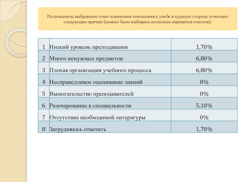 Слайд 16Респонденты выбравшие ответ изменения отношения к учебе в худшую сторону отмечают