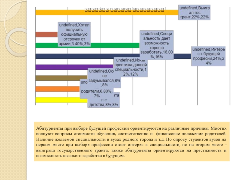 Слайд 12Абитуриенты при выборе будущей профессии ориентируются на различные причины. Многих волнуют