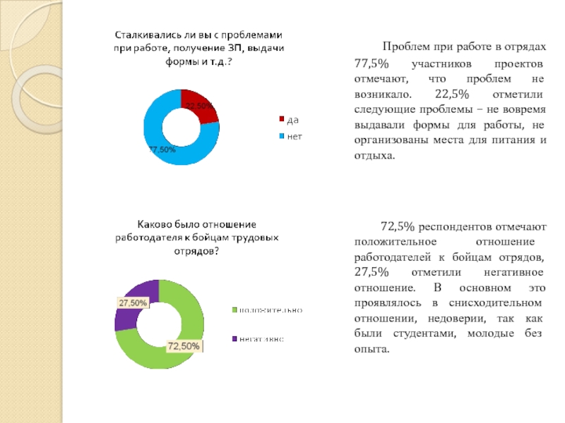 Проблем при работе в отрядах 77,5% участников проектов отмечают, что проблем не возникало. 22,5% отметили следующие проблемы – не вовремя выдавали формы для работы, не организованы места для питания и отдыха.
