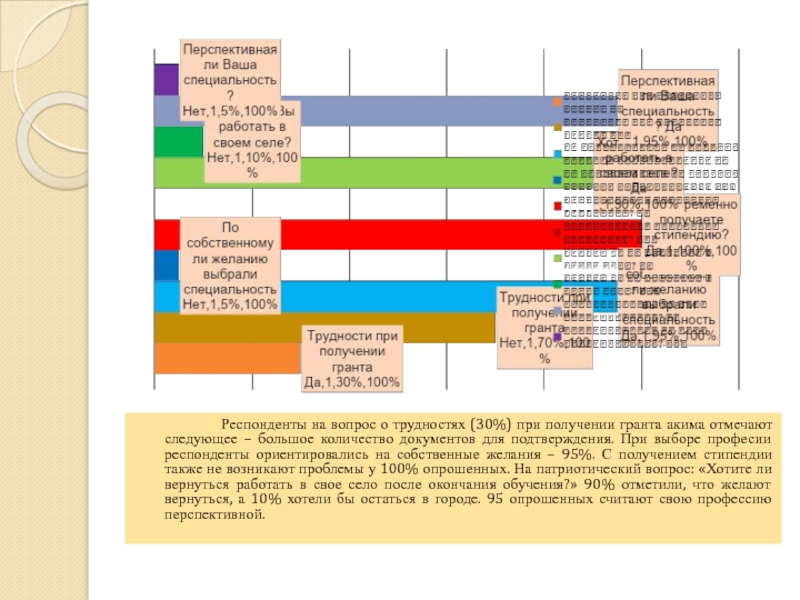 трудностях (30%) при получении гранта акима отмечают следующее – большое количество документов для подтверждения. При выборе професии респонденты ориентировались на собственные желания – 95%. С получением стипендии также не возникают проблемы у 100% опрошенных. На патриотический вопрос: «Хотите ли вернуться работать в свое село после окончания обучения?» 90% отметили, что желают вернуться, а 10% хотели бы остаться в городе. 95 опрошенных считают свою профессию перспективной.