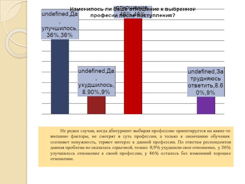 абитуриент выбирая профессию ориентируется на какие-то внешние факторы, не смотрят в суть профессии, а только к окончанию обучения осознают ненужность, теряют интерес к данной профессии. По ответам респондентов данная проблема не оказалась серьезной, только 8,9% ухудшили свое отношение, у 36% улучшилось отношение к своей профессии, у 46% осталось без изменений хорошее отношение.