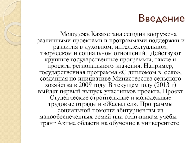 проектами и программами поддержки и развития в духовном, интеллектуальном, творческом и социальном отношений. Действуют крупные государственные программы, также и проекты регионального значения. Например, государственная программа «С дипломом в село», созданная по инициативе Министерства сельского хозяйства в 2009 году. В текущем году (2013 г) выйдет первый выпуск участников проекта. Проект Студенческие строительные и молодежные трудовые отряды и «Жасыл ел». Программы социальной помощи абитуриентам из малообеспеченных семей или отличникам учебы – грант Акима области на обучение в университете.