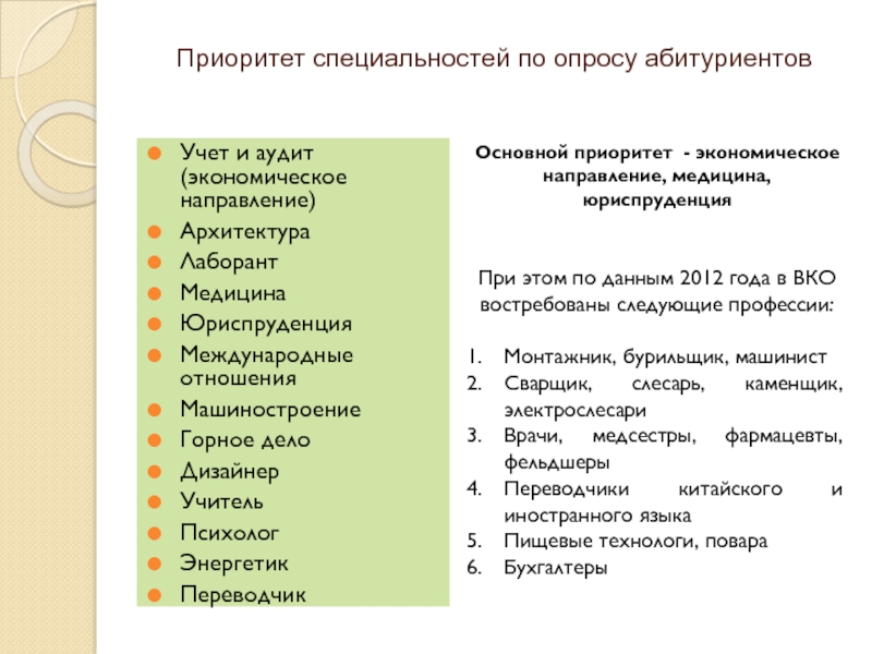 Слайд 10Приоритет специальностей по опросу абитуриентов