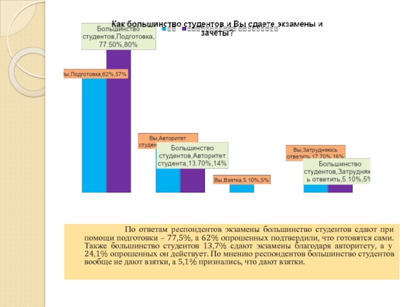 большинство студентов сдают при помощи подготовки – 77,5%, а 62% опрошенных подтвердили, что готовятся сами. Также большинство студентов 13,7% сдают экзамены благодаря авторитету, а у 24,1% опрошенных он действует. По мнению респондентов большинство студентов вообще не дают взятки, а 5,1% признались, что дают взятки.