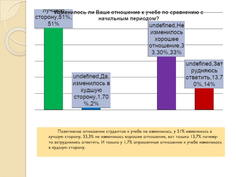 учебе не изменилось, у 51% изменилось в лучшую сторону, 33,3% не изменилось хорошее отношение, вот только 13,7% почему-то затруднились ответить. И только у 1,7% опрошенных отношение к учебе изменилось в худшую сторону.