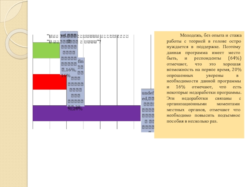 и стажа работы с теорией в голове остро нуждается в поддержке. Поэтому данная программа имеет место быть, и респонденты (64%) отмечают, что это хорошая возможность на первое время, 20% опрошенных уверены в необходимости данной программы и 16% отмечают, что есть некоторые недоработки программы. Эти недоработки связаны с организационными моментами местных органов, отмечают что необходимо повысить подъемное пособия в несколько раз.