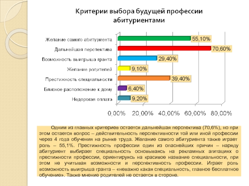 перспектива (70,6%), но при этом остается вопрос – действительность перспективности той или иной профессии через 4 года обучения на рынке труда. Желание самого абитуриента также играет роль – 55,1%. Престижность профессии один из опаснейших причин – наряду абитуриент выбирает специальность основываясь на рекламных агитациях о престижности профессии, ориентируясь на красивое название специальности, при этом не учитывая возможности и перспективность профессии. Играет роль возможность выигрыша гранта – «неважно какая специальность, главное бесплатное обучение». Также мнение родителей не остается в стороне.