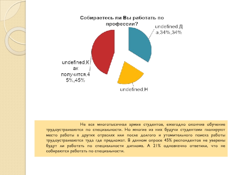 армия студентов, ежегодно окончив обучение трудоустраиваются по специальности. Но многие из них будучи студентами планируют место работы в других отраслях или после долгого и утомительного поиска работы трудоустраиваются туда где предложат. В данном опросе 45% респондентов не уверены будут ли работать по специальности диплома. А 21% однозначно ответили, что не собираются работать по специальности.