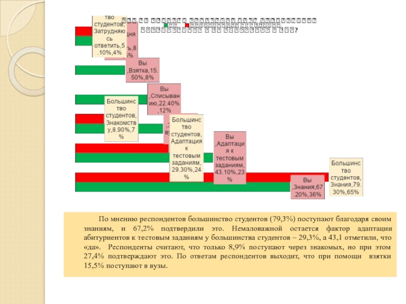 студентов (79,3%) поступают благодаря своим знаниям, и 67,2% подтвердили это. Немаловажной остается фактор адаптации абитуриентов к тестовым заданиям у большинства студентов – 29,3%, а 43,1 отметили, что «да». Респонденты считают, что только 8,9% поступают через знакомых, но при этом 27,4% подтверждают это. По ответам респондентов выходит, что при помощи взятки 15,5% поступают в вузы.