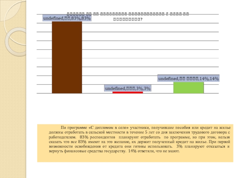 в село» участники, получившие пособия или кредит на жилье должны отработать в сельской местности в течение 5 лет со дня заключения трудового договора с работодателем. 83% респондентов планируют отработать по программе, но при этом, нельзя сказать что все 83% имеют на это желание, их держит полученный кредит на жилье. При первой возможности освобождения от кредита они готовы использовать. 3% планируют отказаться и вернуть финансовые средства государству. 14% ответили, что не знают.