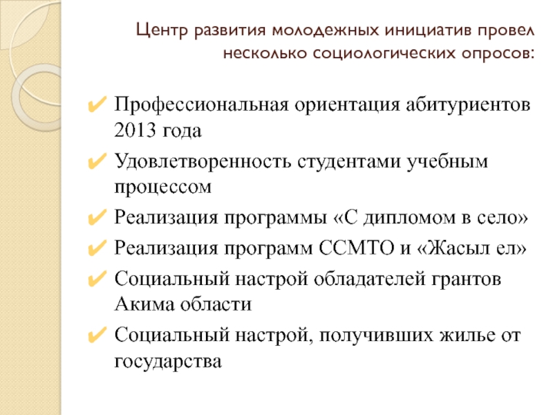 Слайд 3Центр развития молодежных инициатив провел несколько социологических опросов: