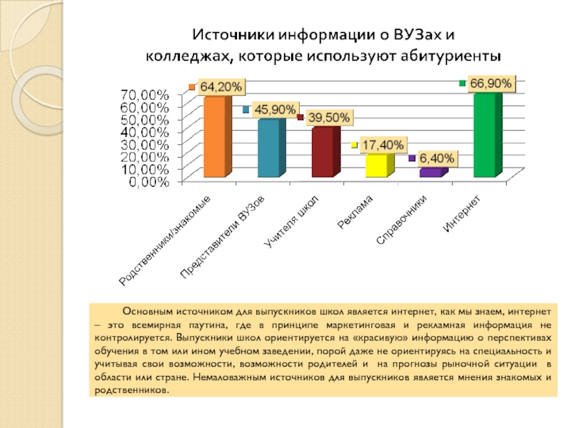 интернет, как мы знаем, интернет – это всемирная паутина, где в принципе маркетинговая и рекламная информация не контролируется. Выпускники школ ориентируется на «красивую» информацию о перспективах обучения в том или ином учебном заведении, порой даже не ориентируясь на специальность и учитывая свои возможности, возможности родителей и на прогнозы рыночной ситуации в области или стране. Немаловажным источников для выпускников является мнения знакомых и родственников.