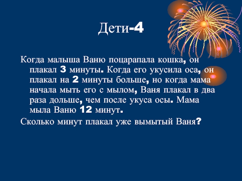 укусила оса, он плакал на 2 минуты больше, но когда мама начала мыть его с мылом, Ваня плакал в два раза дольше, чем после укуса осы. Мама мыла Ваню 12 минут.
