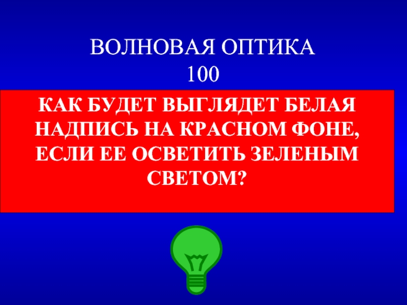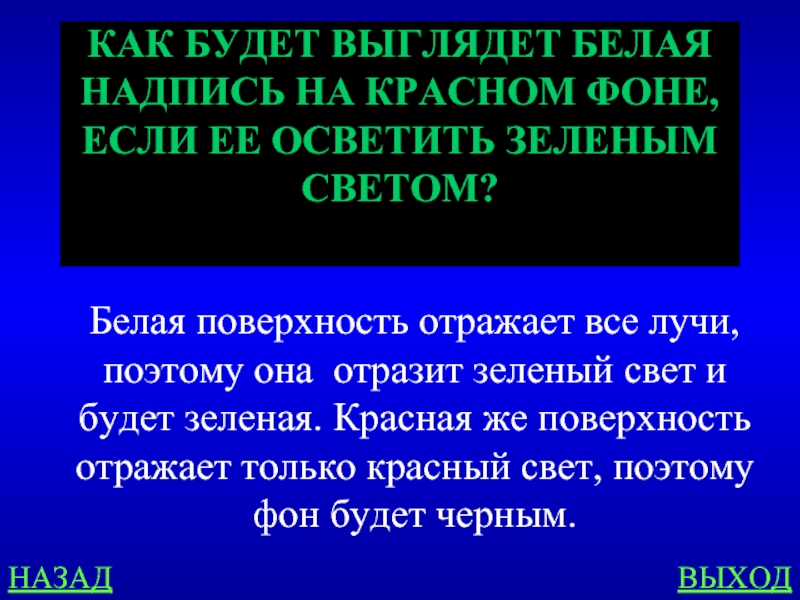 Белая поверхность отражает все лучи, поэтому она отразит зеленый свет и будет зеленая. Красная же поверхность отражает только красный свет, поэтому фон будет черным.