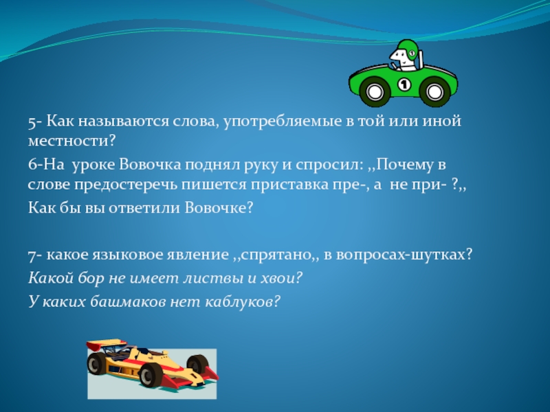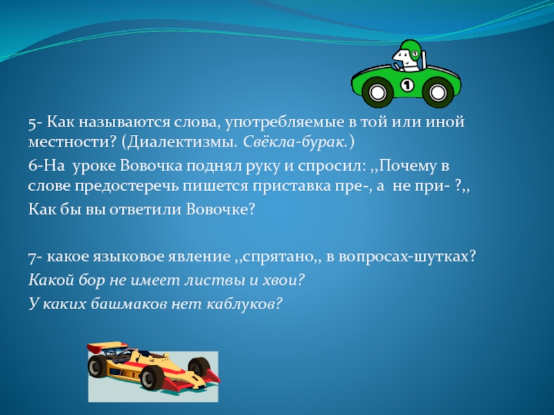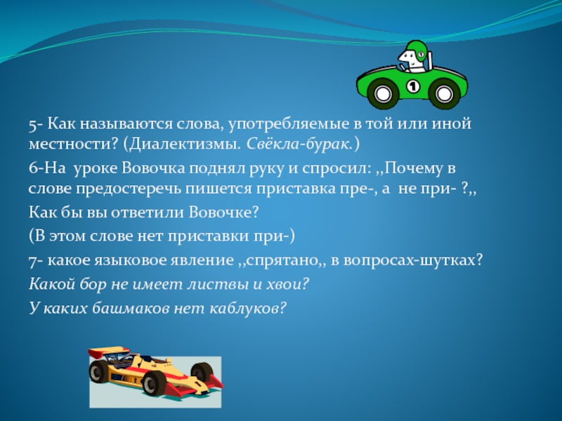 5- Как называются слова, употребляемые в той или иной местности? (Диалектизмы.