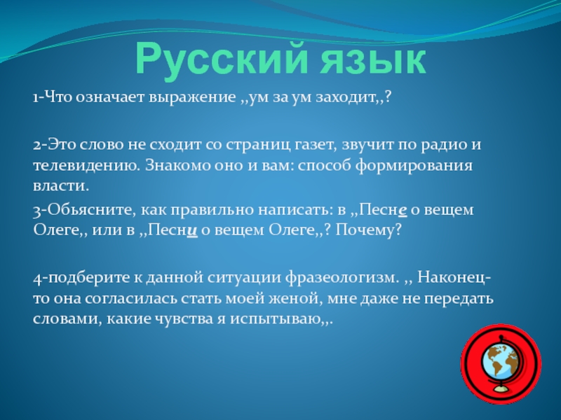 2-Это слово не сходит со страниц газет, звучит по радио и телевидению. Знакомо оно и вам: способ формирования власти.(Выборы)