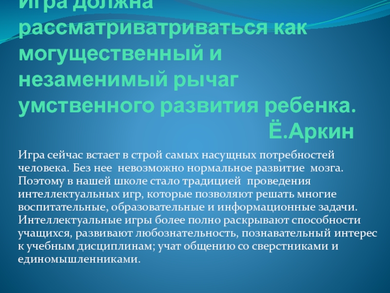 Слайд 2Игра должна рассматриватриваться как могущественный и незаменимый рычаг умственного развития ребенка.